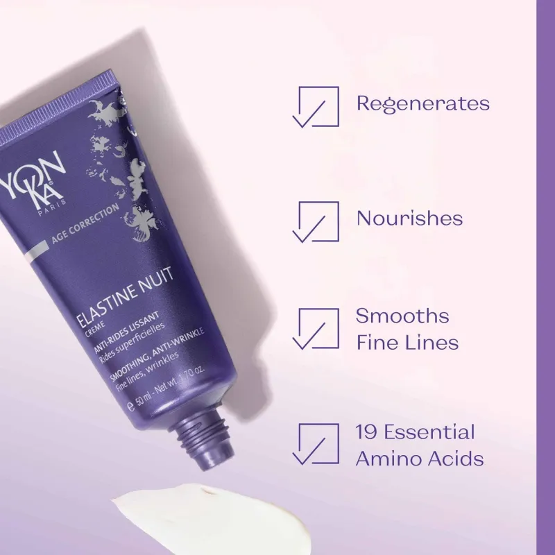 Our luxurious anti-wrinkle night cream is part of a day/night Elastine ritual infused with plumping peptides, antioxidant vitamins, and supremely nourishing amino acids and plant oils that combine to smooth the look of wrinkles and support skin’s age defenses. Elastine Nuit is an exquisite overnight treatment is designed with a triple blend of elastin peptides, soy peptides and milk peptides for a rebuilding effect that visibly plumps the skin to diminish the appearance of fine lines and deeper wrinkles. A high concentration of emollient wheat germ oil deeply nourishes and moisturizes the skin as 19 amino acids help to repair damaged skin. Perfectly complements our Elastine Jour for a comprehensive anti-aging routine around the clock.